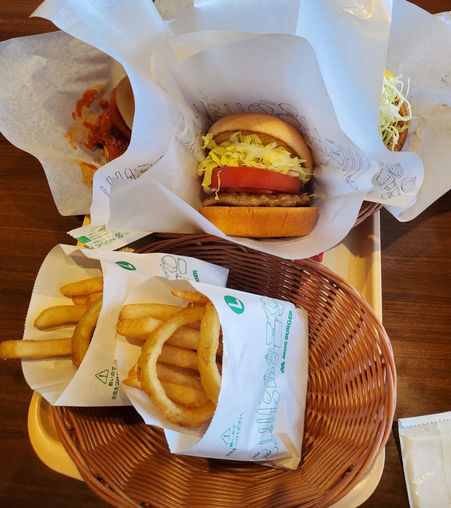 妻は、野菜バーガーとオニポテセット、フィッシュバーガー、アイスコーヒー。私は、モスバーガーとオニポテセット、和風旨だれのとり竜田バーガー~くし切りレモン添え~を頼みました。