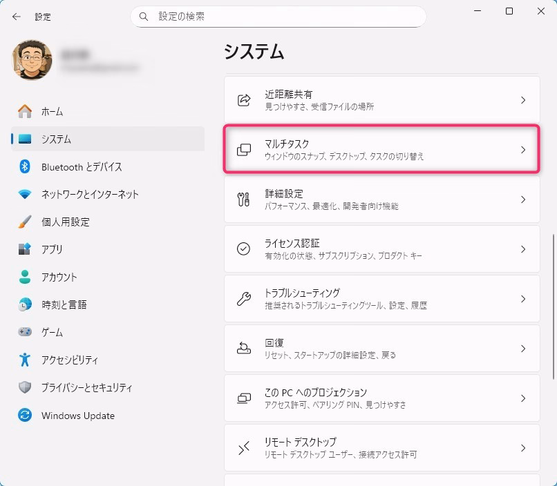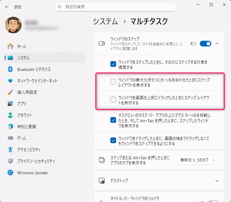 以下は、Windows 11で画面分割マルチタスク機能を無効化する手順です。