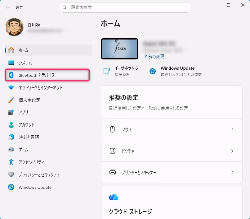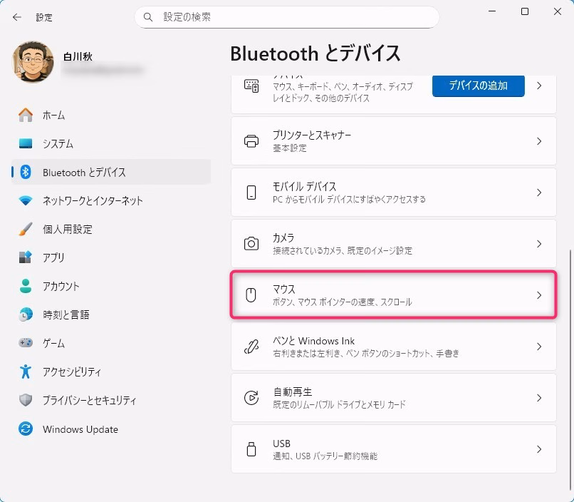 デバイス関連の項目がずらっと並んでいるので、その中の「マウス」を探します