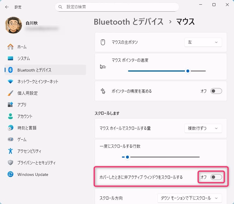 設定をオフにすると、他のアプリでも「マウスを当てただけでスクロール」する動作がなくなったり、アプリの中から「ファイルを指定して選択」といった場合にスクロールが使えないときがあります。もしその機能を使いたい場面があれば、また同じ手順でオンに戻せばOKです。