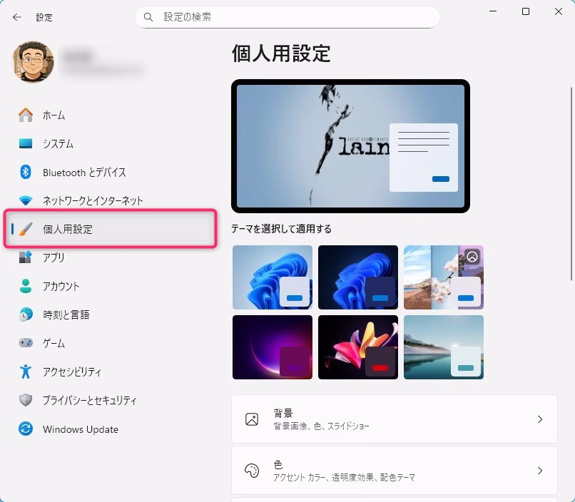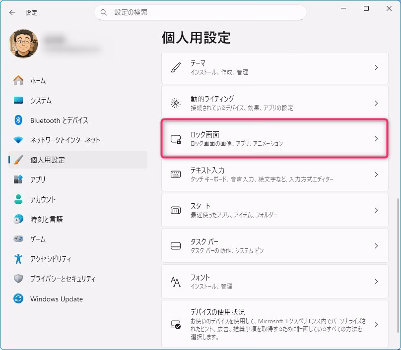 設定画面が開いたら、「個人用設定」という項目を探してクリック。
