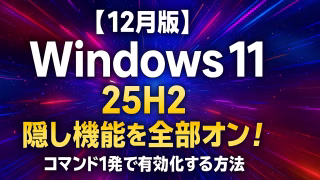 ニュース 【12月版】Windows11「25H2」隠し機能を全部オン!コマンド1発で有効化する方法 Windows11の最新バージョン「25H2」、もうアップデートしました?実はこのアップデート、2025年9月30日にリリースされたんですけど、新しいスタートメニューとか、カラフルなバッテリーアイコンとか、AIアクションとか...めっちゃ便... 2025.12.04 0 ニュース
