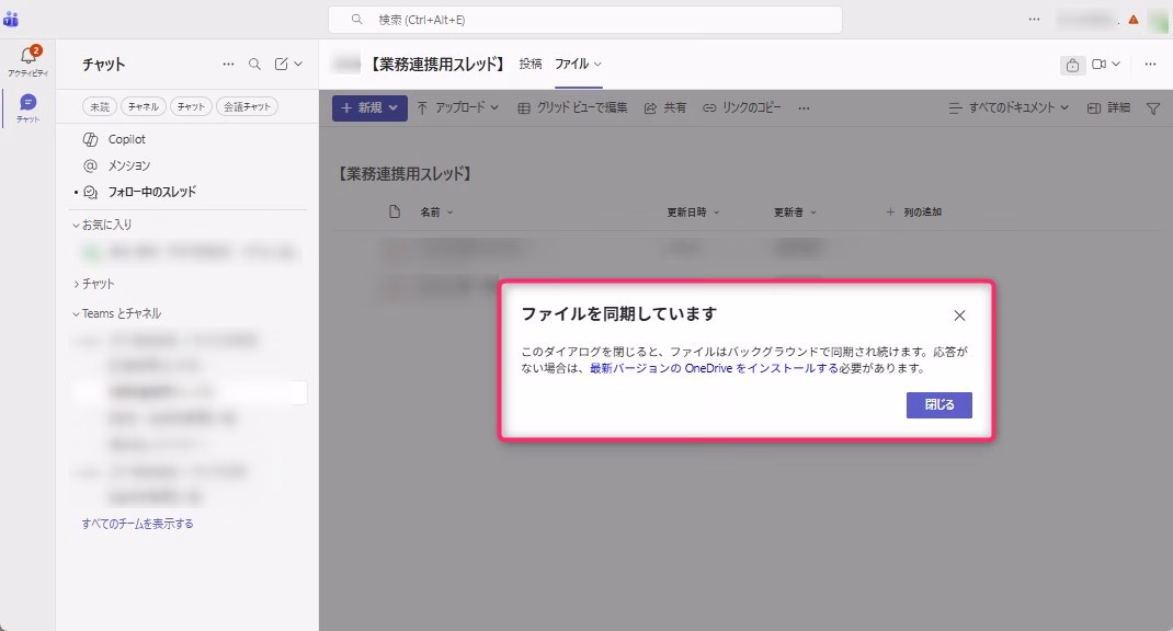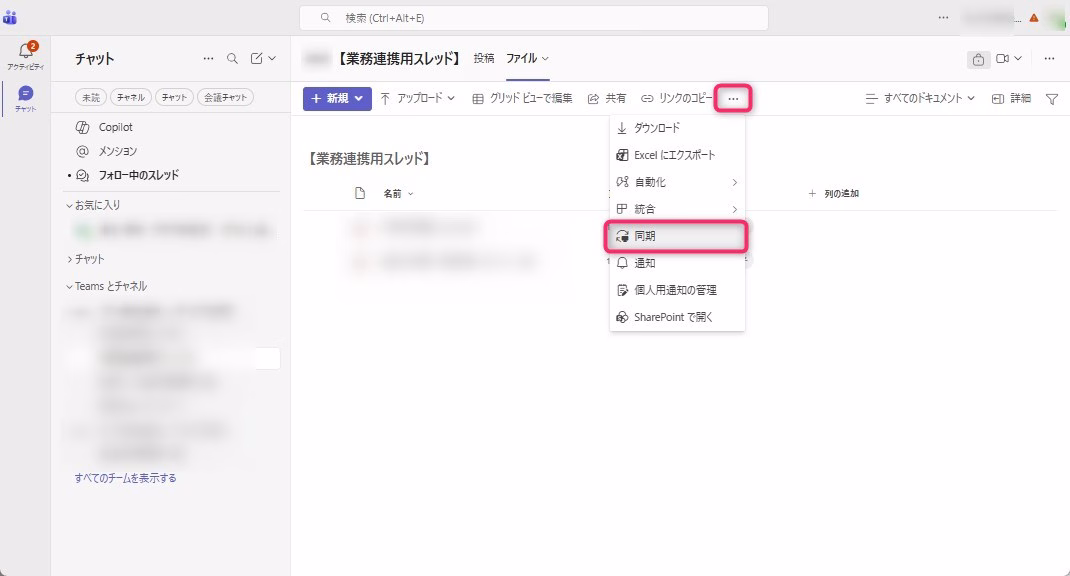 - Teamsでチャネルを開く: 同期したいチームのチャネルを選択します。