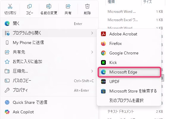 - PDFファイルを右クリック→「プログラムから開く」→「Microsoft Edge」を選ぶ