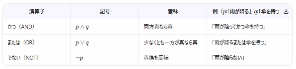 複合(合成)命題基本命題(p,q)を論理演算子でつなげたもの: