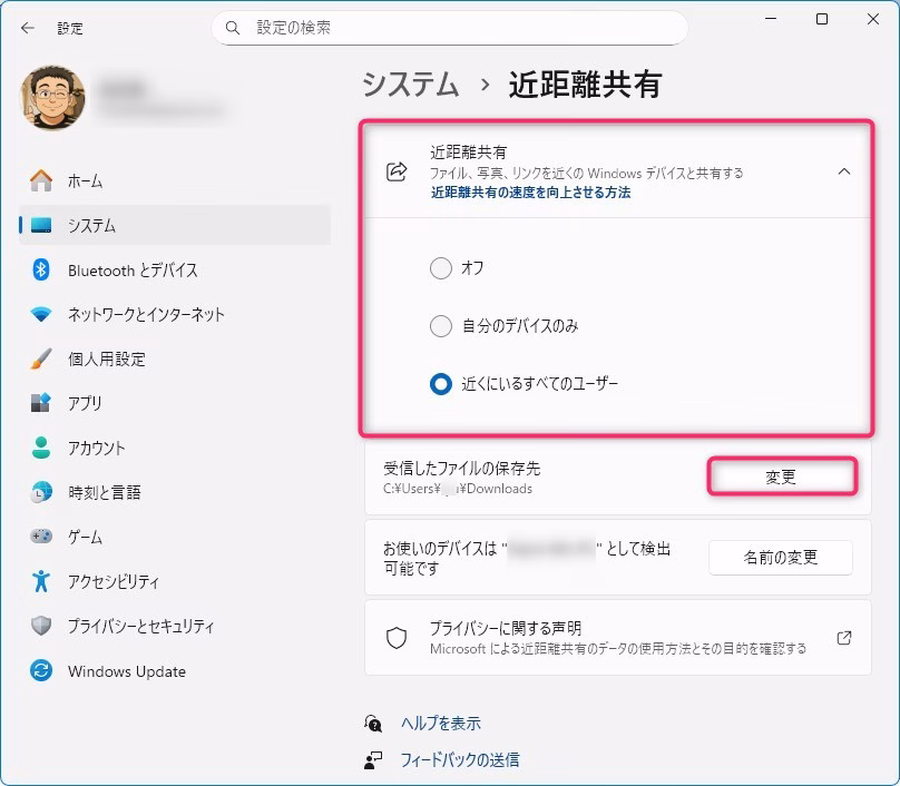 「近くにいるすべてのユーザー」に設定していると、周りにいる人全員があなたのパソコン名を見ることができます。カフェなど公共の場所では、使わないときはオフにしておいた方が安全かもしれません。