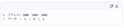 | 配列 | → 同じ型のデータを、メモリ上で連続して格納。 特徴: インデックスで直接アクセス: list[i] は O(1)(定数時間)サイズ固定(動的配列は別) メモリ効率◎(ポインタ不要) 🔹 例(3要素): ![]() → list[2] = アドレス 1000 + 2×4 = 1008 → 即座にC✅ 利点:アクセスが超高速 ❌ 欠点:中央への追加・削除は O(n)(データをずらす必要あり) |