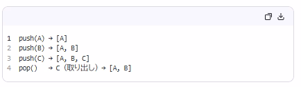 | スタック | → 「最後に入れたものが最初に取り出される」(LIFO: Last In, First Out) 操作: ・ push(x):上に乗せる・ pop():一番上のものを取り出す・ top():一番上を覗く(取り出さない)🔹 例(皿の山): ![]() ✅ 応用: ・関数呼び出し(ローカル変数の保存/復元) ・式の評価(逆ポーランド記法) ・深さ優先探索(DFS) |