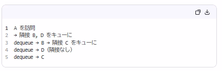| 幅優先探索(BFS順) | → レベルごとに左→右で訪問。キューで実現。![]() 🔹 上記木で: A → B → C → D → E📌 特徴: ・最短経路(非重み)を保証 ・メモリ使用量は最大幅に比例 |