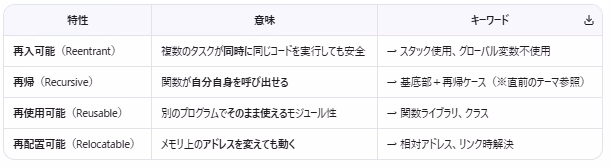 | 再帰 | (前テーマで詳細済みのため、ここでは再入可能との違いに焦点) →リカーシブともいう。 ・再帰:1つの実行流れの中で、関数が自分を呼び出す(深くなる) ・再入:複数の実行流れが同時に同じ関数コードを実行(並列) 📌 関数が「再入可能」であれば、再帰+マルチスレッドでも安全。 |