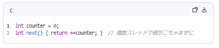 | 再入可能 | → 割り込みやマルチスレッドで安全に呼び出せる関数。リエントラントともいう。 条件: ・グローバル変数・静的変数を使わない ・引数やローカル変数(=スタック上)のみを使う 🔹 例(安全): ![]() ❌ 危険(非再入): ![]() ✅ 応用:OSカーネル、割り込みハンドラ、スレッド関数 |