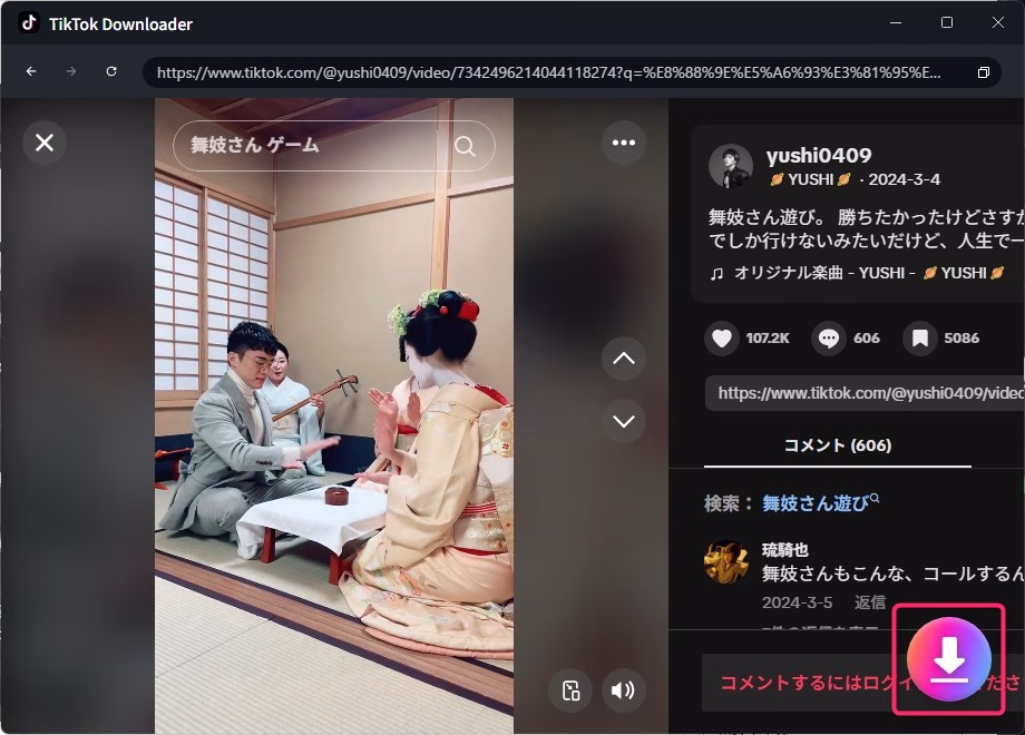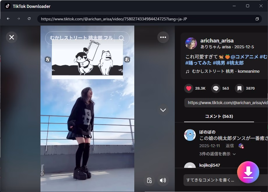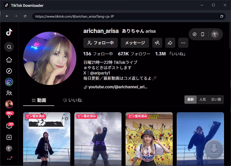 他の動画で、再チャレンジしてみます。僕がひっそり推している「ありちゃん arisa」さんのページから動画をダウンロードしてみます。