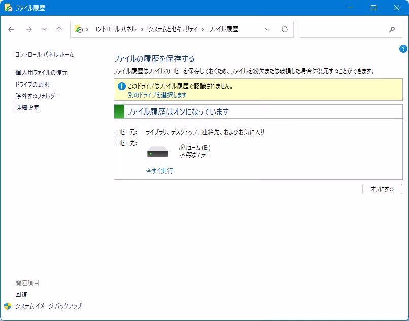 ファイル履歴だけ設定しておく。写真や文書だけでも守れればひとまずOK。