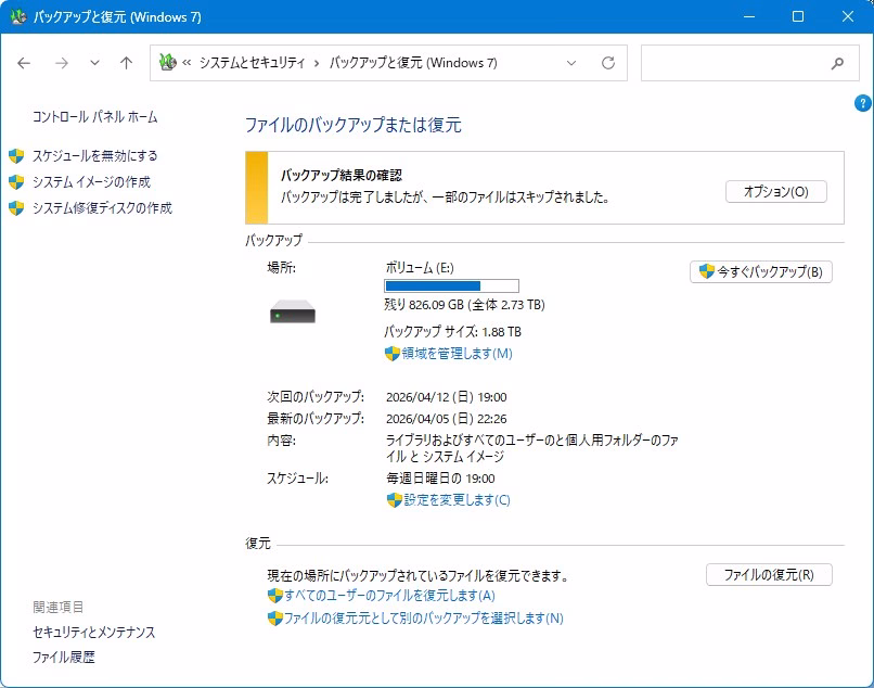 ファイル履歴 + システムイメージの2本立て。月1回程度システムイメージを更新する。