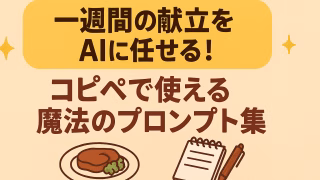 作業効率化 一週間の献立をAIに任せる!コピペで使える魔法のプロンプト集 「今日の夕飯、何にしよう…」この言葉、今週何回つぶやきましたか?月曜日から日曜日まで、毎日毎日献立を考えるのって本当に大変ですよね。栄養バランス、家族の好み、冷蔵庫の中身、予算…考えることが多すぎて、頭がパンクしそう。でも、AIに「正しい頼... 2025.10.19 0 作業効率化