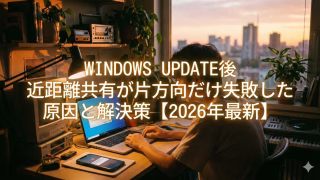 日常パソコン部 Windows Update後に近距離共有が片方向だけ失敗した原因と解決策【2026年最新】 自分PCから仕事用ノートPCへ近距離共有で送れない!でも逆方向はOK……そんな片方向トラブルで困っていませんか?実はWindows Updateが原因で複数の設定が変わってしまうことが多いんです。4つのチェックポイントを押さえるだけで自力解決できます。同じ症状に悩むあなたのお役に立てれば嬉しいです! 2026.02.26 0 日常パソコン部